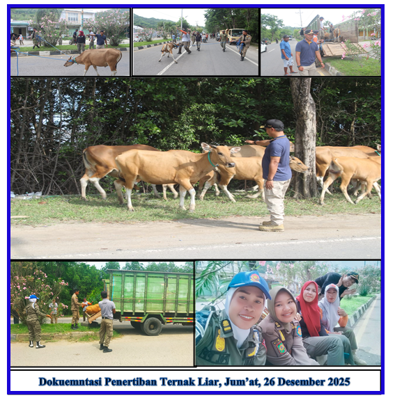 KOTA BIMA –Dibawah Garis Komando Kasat Pol. PP Kota Bima Bapak ERWIN RAHADI, S.Sos bersama Personel Satuan Polisi Pamong Praja (Satpol PP) Kota Bima kembali menggelar Operasi enertiban ternak liar pada Jumat pagi, 26 Desember 2025.